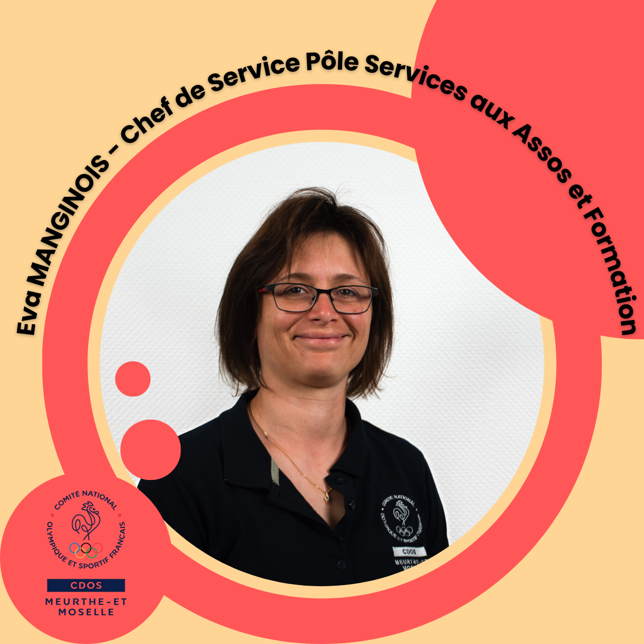 Eva est arrivée au CDOS 54 en 2002. Ses missions consistent actuellement à superviser le développement d’actions permettant d’aider à la professionnalisation et à la structuration d’associations sportives du département. Elle est en charge plus particulièrement de l’intermédiation de Service civique et de la mise en place du Diplôme Universitaire « GeDeSAS ».